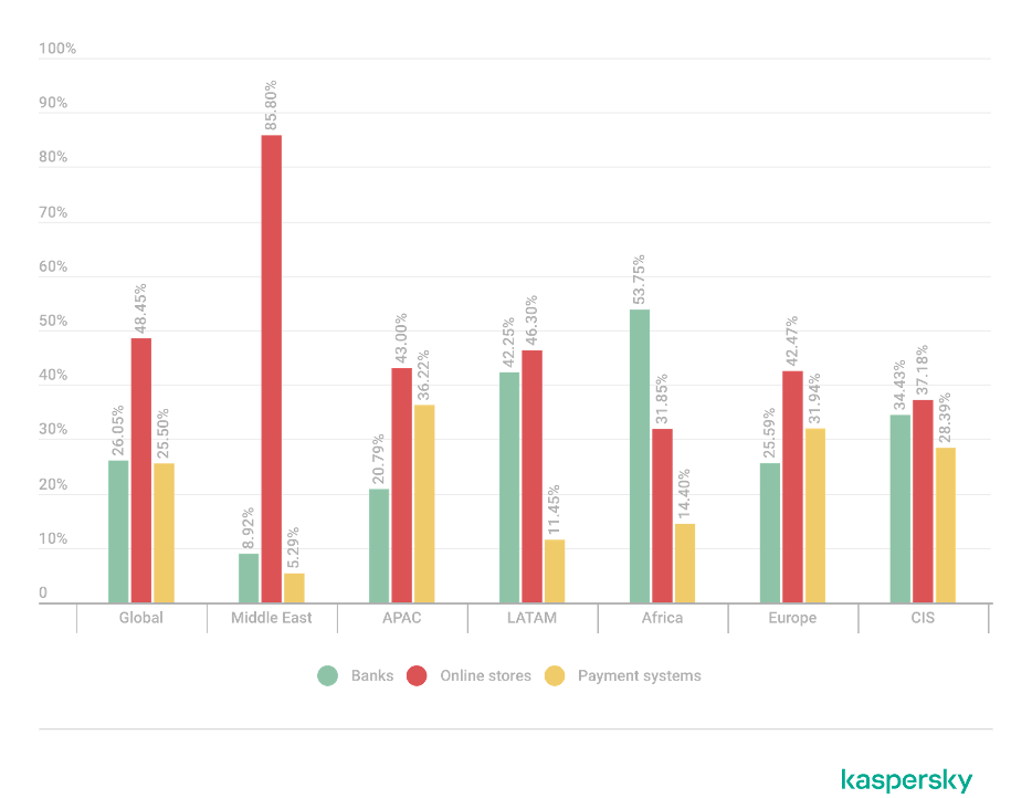 Attackers are adapting campaigns to regional digital habits. In the Middle East, financial phishing is overwhelmingly concentrated on e-commerce (85.8%), indicating a heavy reliance on online retail lures, whereas in Africa bank-related phishing leads (53.75%), which may indicate that user account security there is still insufficient. LATAM shows a more balanced distribution but with a higher share of e-commerce (46.3%) and bank targeting (42.25%), while APAC and Europe display a more even spread across all three categories, pointing to diversified attack strategies.